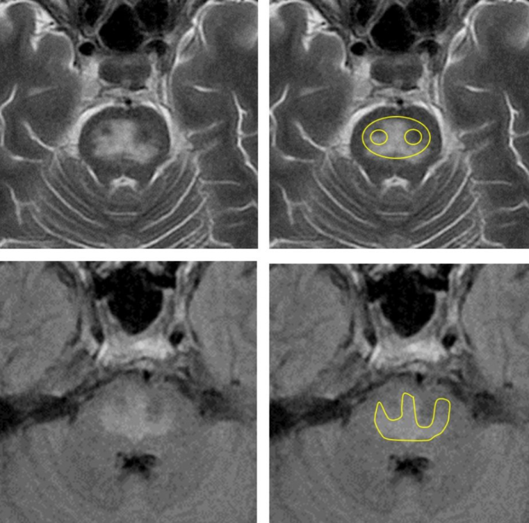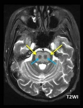 - MRI findings: T2/FLAIR hyperintensity in the central pons, sometimes described as a trident or bat-wing pattern; extrapontine lesions may also be present.