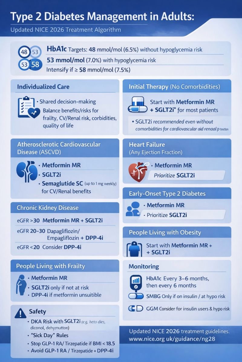 ✅ Core principle: choose glucose-lowering therapy based on cardiovascular disease, heart failure, CKD/eGFR, weight, and hypoglycaemia risk — not HbA1c alone. NICE updated NG28 in February 2026 with broader first-line use of SGLT2 inhibitors in several groups (including when metformin cannot be used).