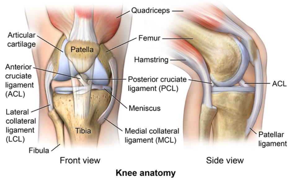 The knee is the largest synovial joint in the body and functions as a modified hinge joint. It primarily allows flexion and extension, with small degrees of rotation when flexed. Although superficially simple, it is biomechanically complex, relying heavily on ligaments and surrounding muscles for stability rather than bony congruence.