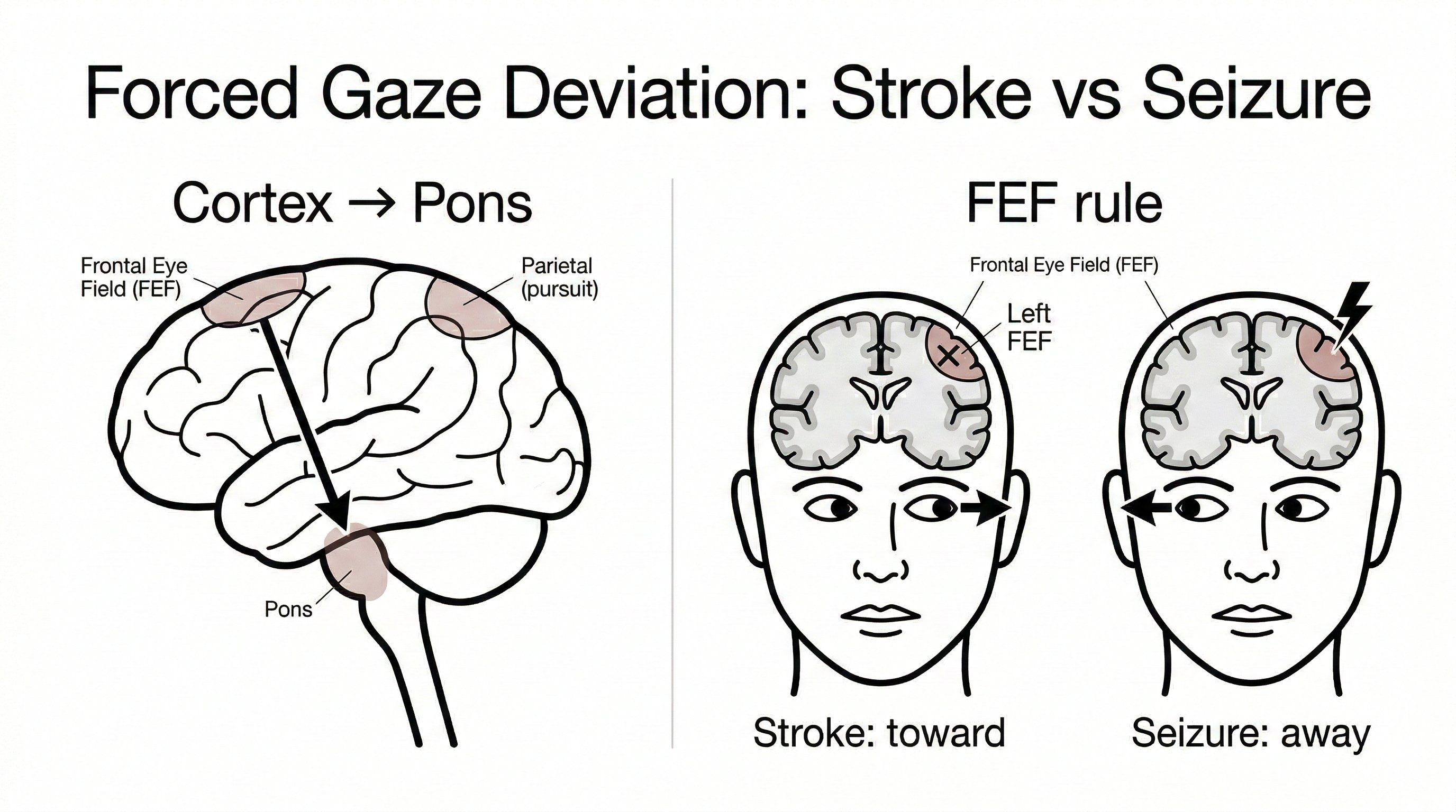 - Mechanism (e.g., rightward gaze): Right PPRF excites right VI nucleus → right lateral rectus + MLF to left III nucleus → left medial rectus → conjugate right gaze.