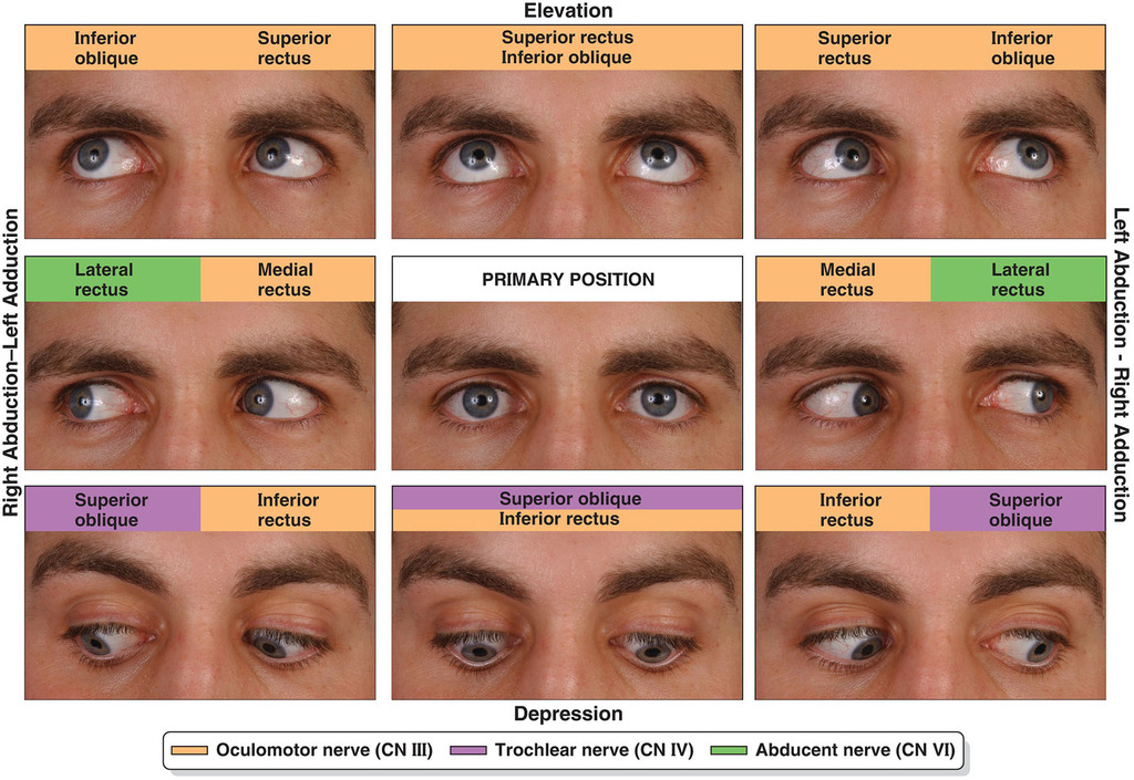 - Inferior oblique: elevates, abducts, extorts → CN III.