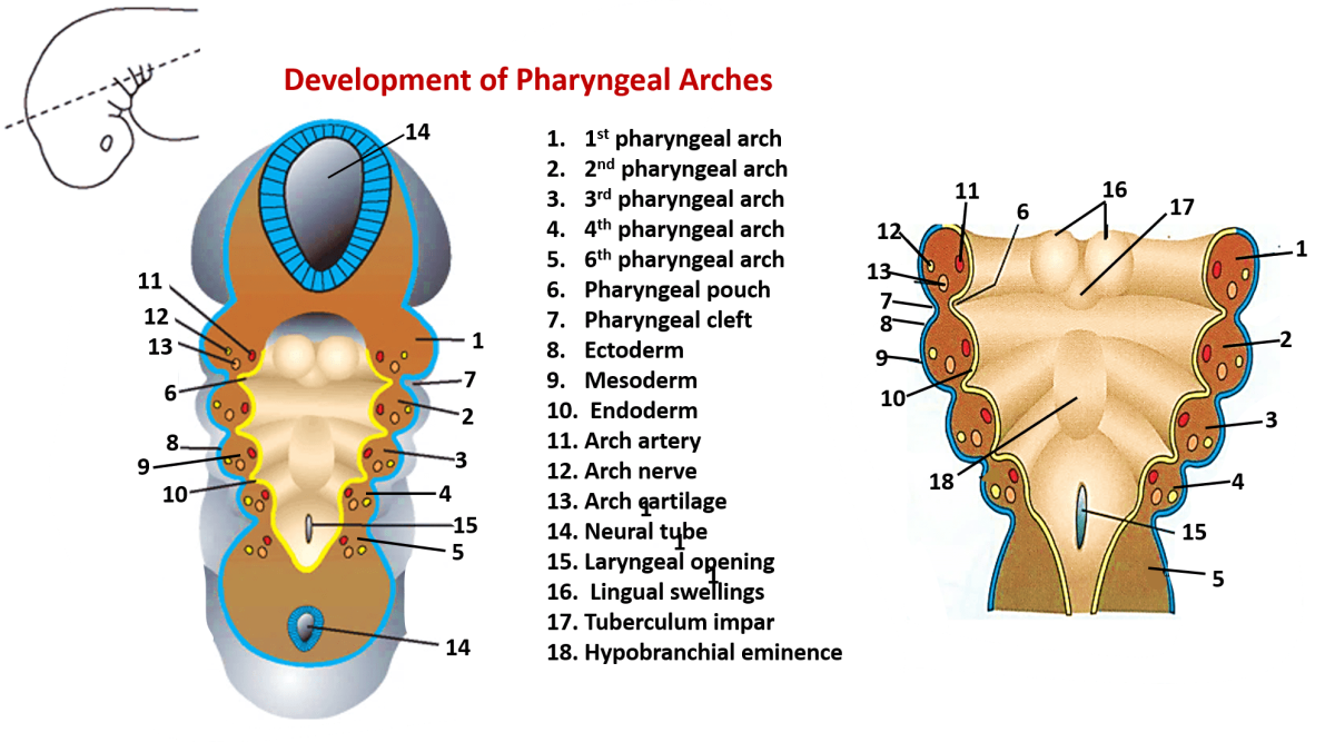 - 5 Arches: Arches 1, 2, 3, 4, and 6 (Arch 5 is rudimentary and disappears): Derived from mesoderm.
