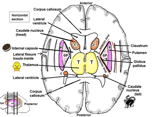 The caudate and putamen are collectively termed the striatum, connected by grey bridges crossing the internal capsule (giving the putamen its โstripedโ appearance).