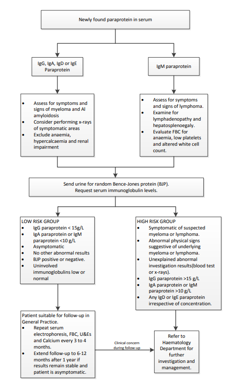 - Tests: FBC, calcium, creatinine, albumin, SPE with paraprotein quantification.