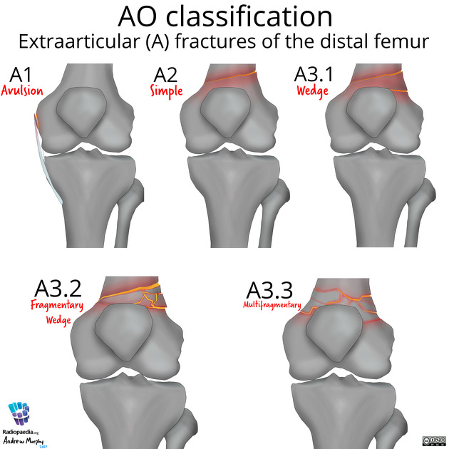 - Always assess neurovascular status in distal femur fractures (femoral/popliteal artery at risk).