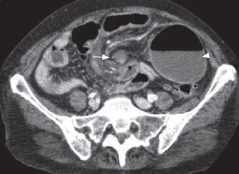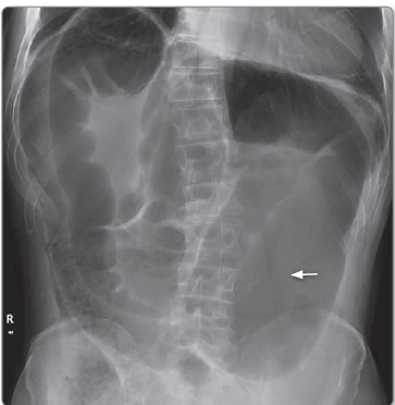 the mesentry in caecal volvulus (arrow). The caecal pole is lying on the left of the