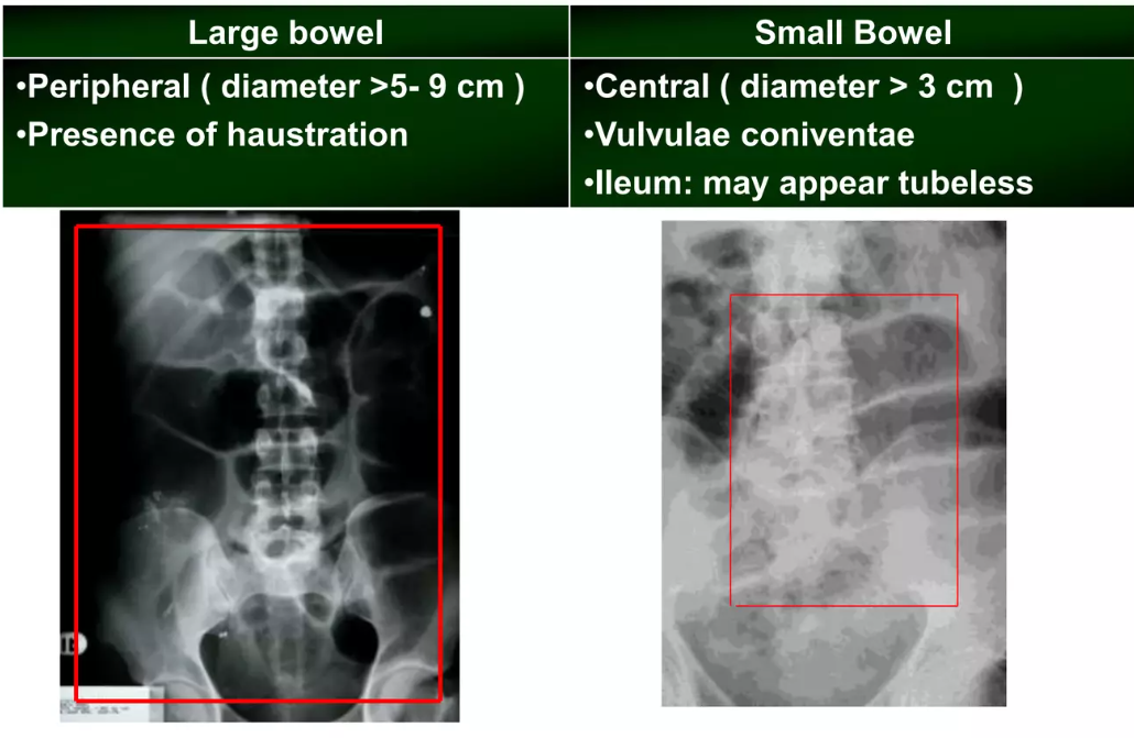 | AXR | Central dilated loops, valvulae conniventes across bowel | Peripheral dilatation, haustra not spanning full lumen |