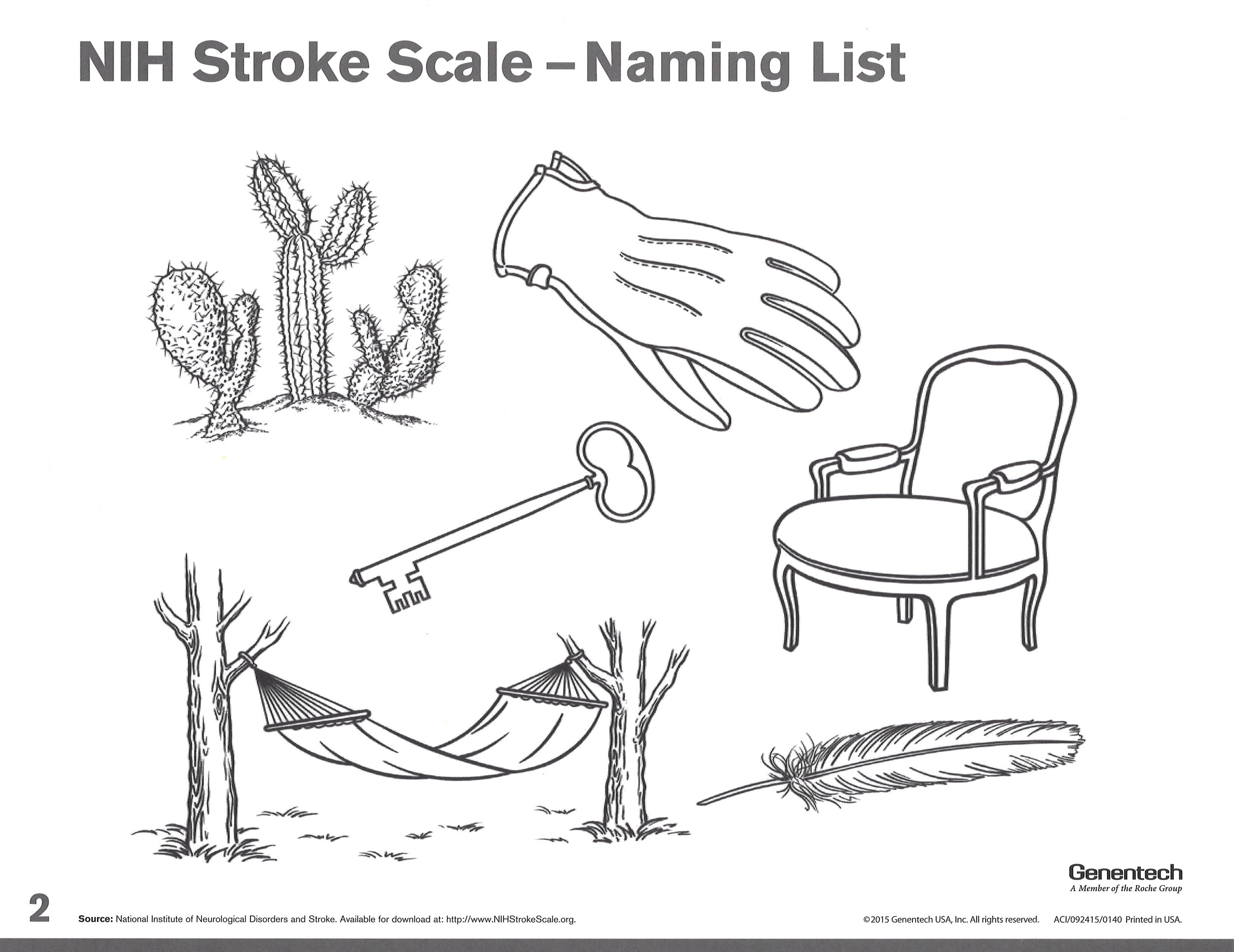 | 9. Best language (aphasia) | Use the standard materials: picture description, naming, and sentence reading. Score overall aphasia severity (fluency + comprehension + naming). | 0 none โข 1 mild/moderate โข 2 severe โข 3 mute/global (or coma) |