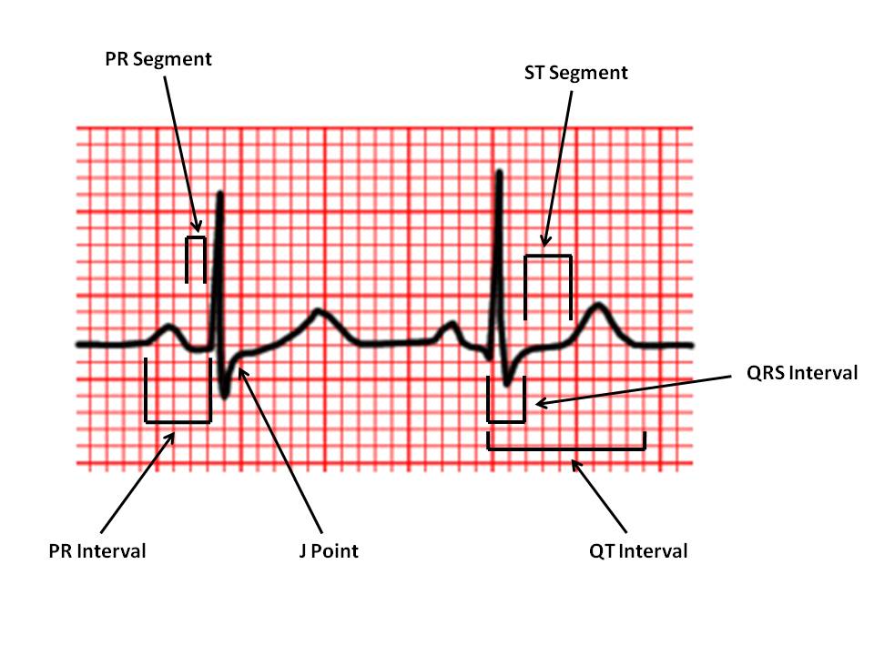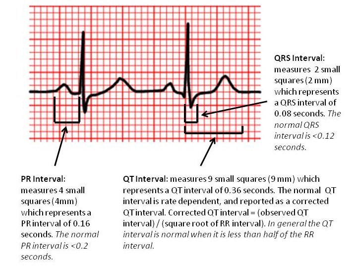 Measure the PR, QRS, and QT intervals. On a 25 mm/sec ECG, each small square represents 0.04 seconds, and each large square represents 0.2 seconds.
