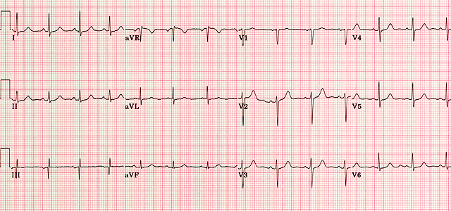 - Elevated ST segment > 1 mm in limb leads or > 2 mm in precordial leads