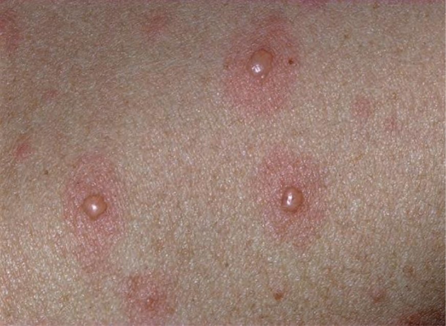 - Classic rash: intensely itchy vesicles on erythematous base (โdew drop on a rose petalโ), starting on trunk then face/scalp, sparing palms/soles.
