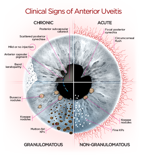 - Anterior uveitis: Iritis, cyclitis, or iridocyclitis.