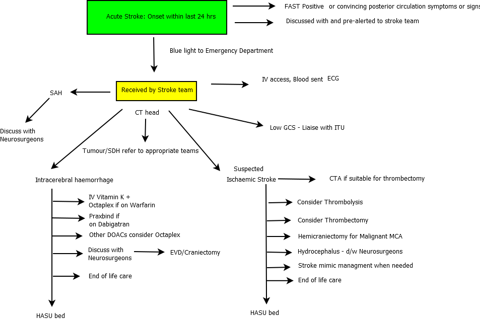 FAST positive โ CT within 1 h โ Thrombolysis if eligible (<4.5 h) โ CTA for thrombectomy if LVO โ Admit to HASU for monitoring & prevention.