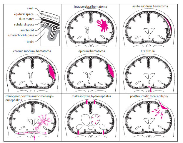 Skull Fractures | Linear, depressed, basilar | CSF leak, Battleβs sign, cranial nerve palsy | CT, repair if needed, meningitis prophylaxis |