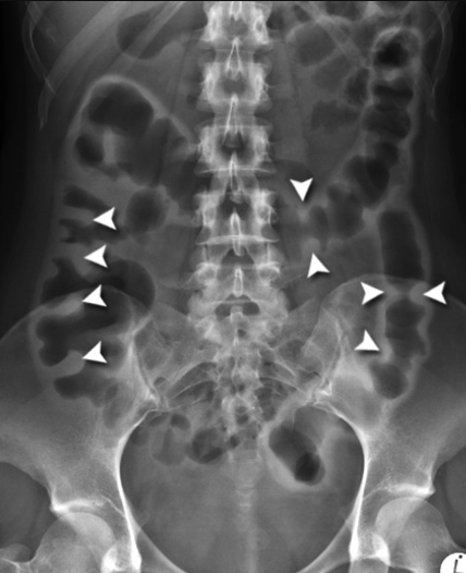 • “Stack of coins” / “step-ladder” appearance with multiple air-fluid levels on erect film.