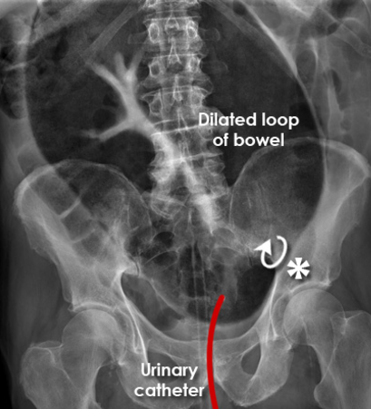 • Massively dilated loop, often extending from pelvis to diaphragm.
