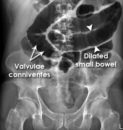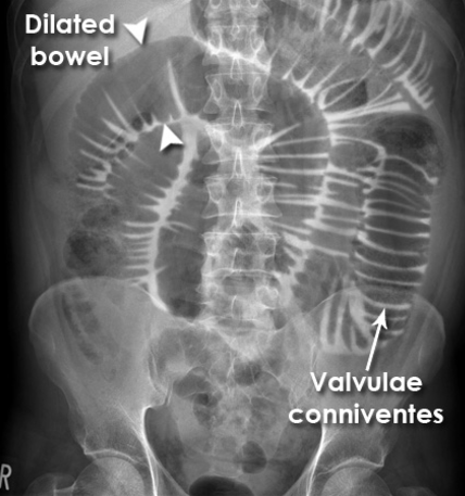 • Small bowel: Central, valvulae conniventes (lines crossing entire width), diameter < 3 cm.