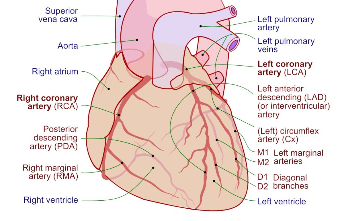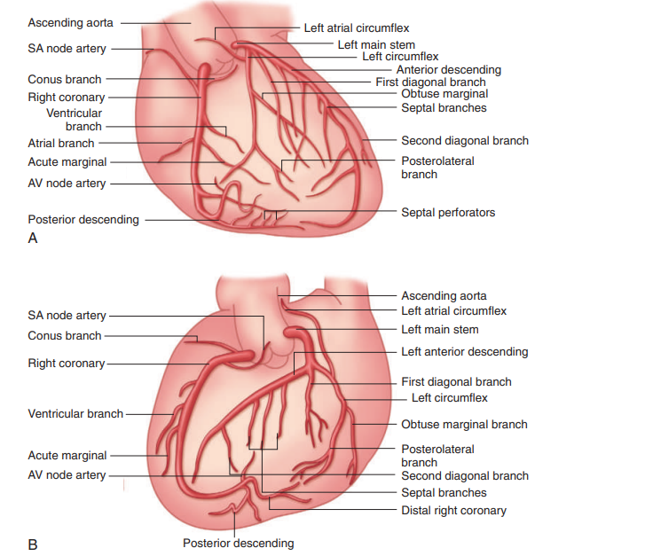 LCA | Left aortic sinus | LAD (septal + diagonal), LCx (obtuse marginals) | LAD → anterior LV, septum, apex