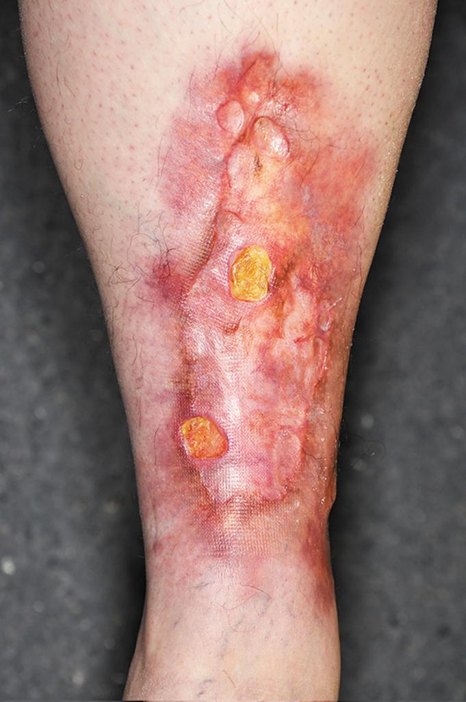 - Lesions usually on the anterior shins, less commonly on arms, trunk, or scalp.