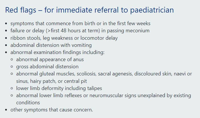 Early recognition and treatment prevent chronic complications such as faecal impaction and encopresis.
