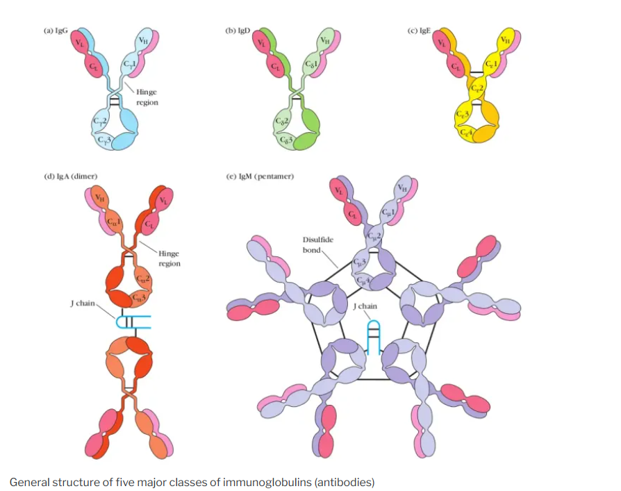 Immunoglobulins (Ig), also known as antibodies, are glycoprotein molecules produced by plasma cells. They play a crucial role in the immune system by recognizing and binding to specific antigens, such as pathogens or foreign substances, and facilitating their neutralization or destruction. Two identical heavy and light (H-L) chain combinations are also held together by disulfide bridges forming a basic four-chain (H-L)2 antibody structure, a dimer of dimers. Basically, an antibody molecule has two functions i.e., antigen binding and effector functions. The binding of an antibody with an antigen is very specific (i.e., a single antibody can not bind with different antigens/epitopes) which is determined by the structural configuration of the antigen-binding region of that antibody.