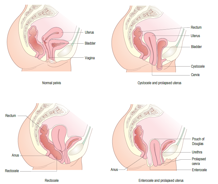 - ๐ Rectocele: Rectum pushes into posterior vaginal wall โ constipation symptoms.