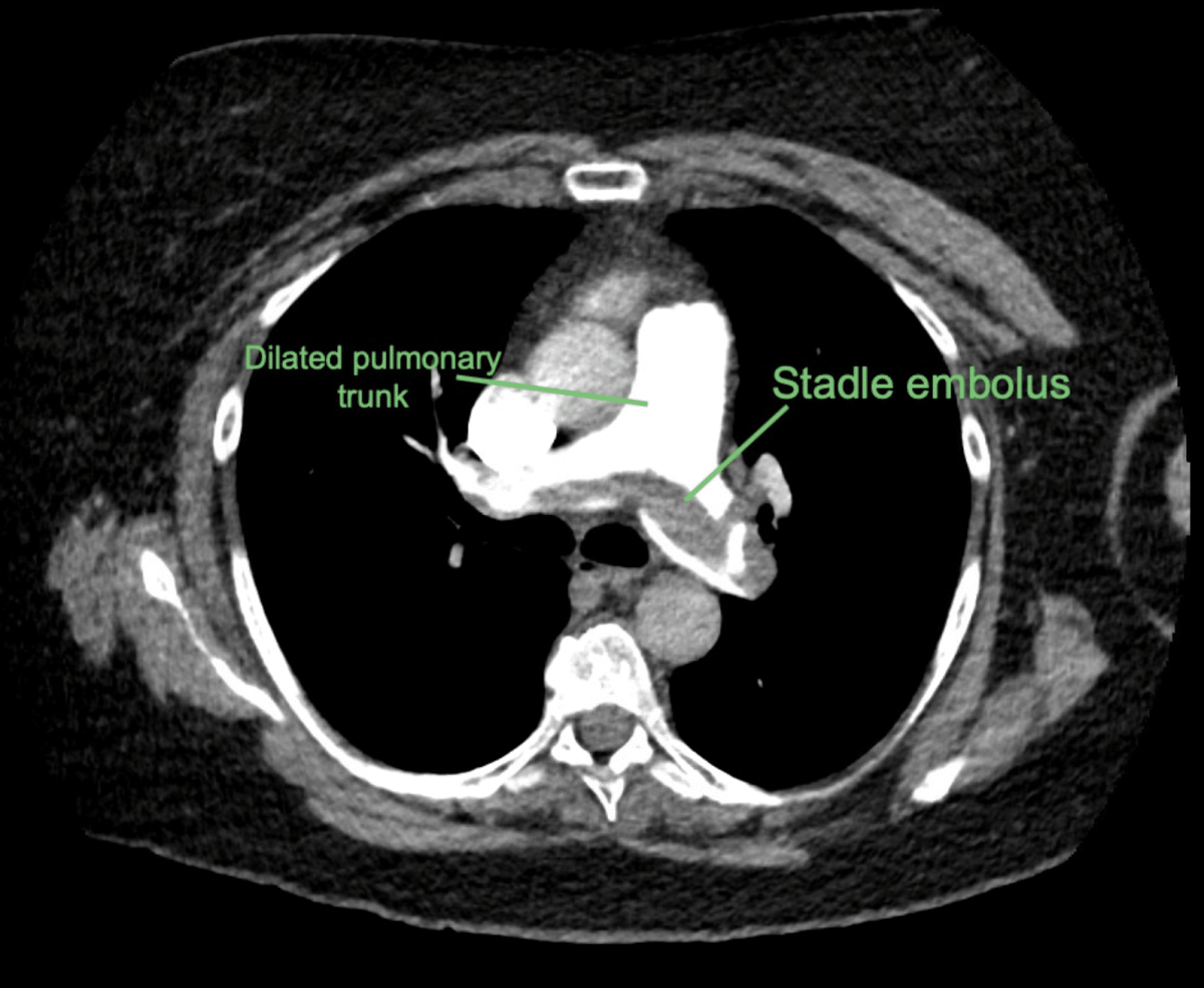 CT Pulmonary Angiogram (CTPA): Saddle embolus at bifurcation of pulmonary arteries.