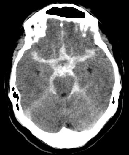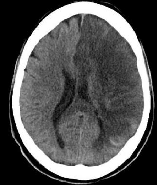 Dense L MCA + ACA infarction with oedema: Shows early swelling, loss of greyโwhite differentiation.