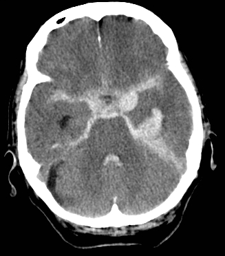 Blood in basal cisterns/sulci, usually from ruptured aneurysm. "Thunderclap headache".