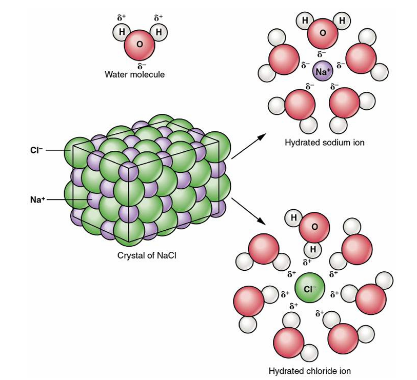NaCl does not dissolve as intact molecules but dissociates into Na⁺ cations and Cl⁻ anions, each surrounded by water molecules (hydration shells) → stabilising ions in solution. 🔑 This principle explains conduction in nerves and osmotic gradients.