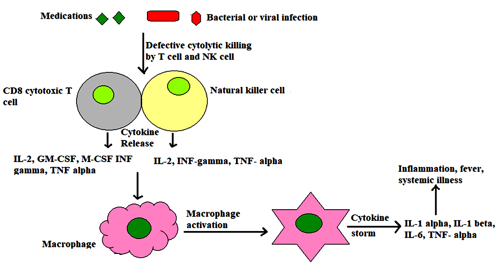 What it is: MAS is a life-threatening hyperinflammatory state on the spectrum of secondary HLH, most often complicating systemic JIA / adult-onset Still’s, but also SLE, vasculitis, infection, or malignancy. A failure of cytotoxic (NK/CTL) pathways → unchecked macrophage activation → a cytokine storm (💥 IL-1, IL-6, IFN-γ) causing fever, cytopenias, hepatitis, coagulopathy, and multi-organ failure.