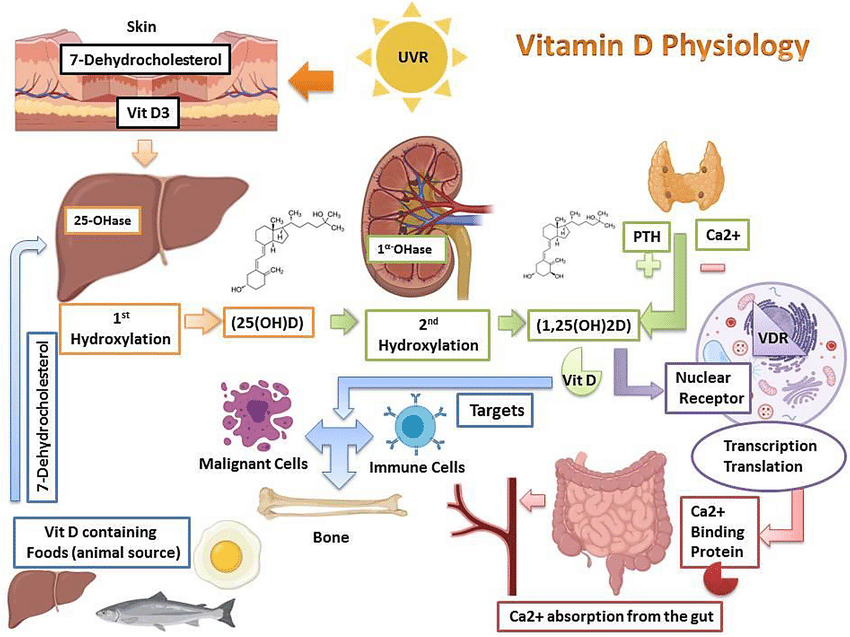 Vitamin D is a fat-soluble vitamin that behaves like a steroid hormone. It is vital for calcium and phosphate homeostasis, bone mineralisation, and muscle function. The two main forms are cholecalciferol (D₃) from sunlight/animal sources and ergocalciferol (D₂) from plants.