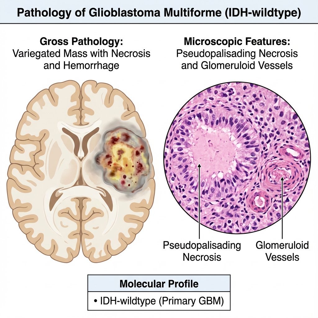 Modern classification integrates molecular genetics with histology. Adult glioblastoma is defined as an IDH-wildtype diffuse astrocytic tumour with specific molecular features, even if classical histology is incomplete. This molecular shift reflects improved prognostic accuracy and trial stratification.