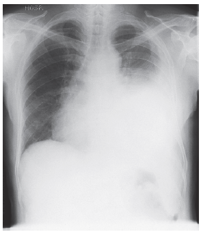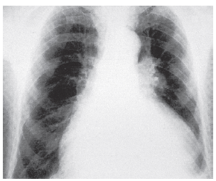 β’ Enlarged, globular βwater-bottleβ cardiac silhouette.
