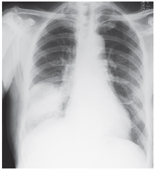 β’ Loss of right hemidiaphragm outline (silhouette sign).