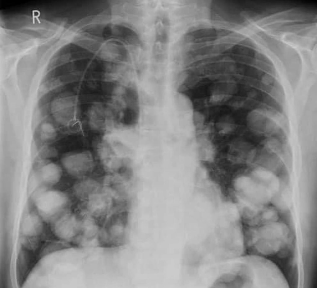 β’ Multiple, well-circumscribed round pulmonary nodules.