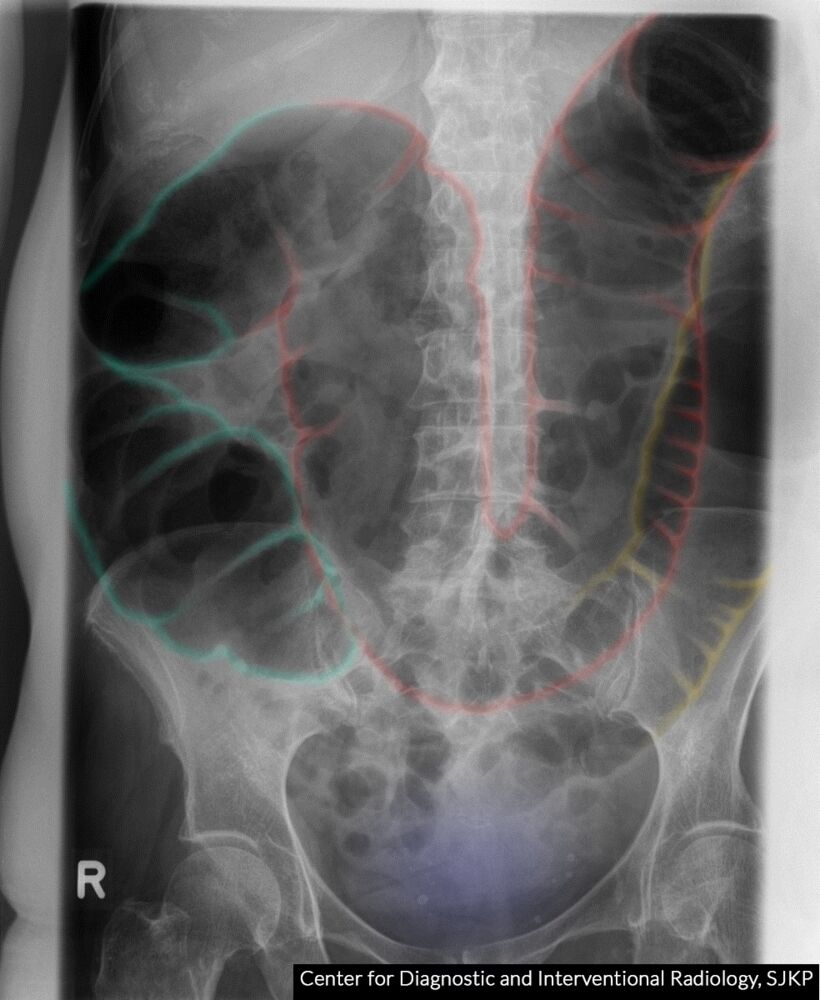 • Massively dilated sigmoid colon arising from the pelvis.