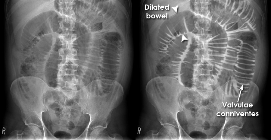 • Dilated central small bowel loops (>3 cm diameter).