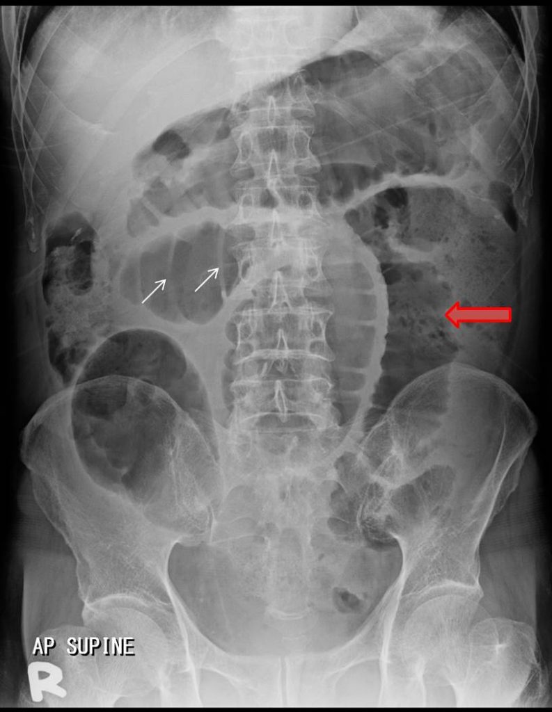 • Multiple air–fluid levels on erect films (step-ladder pattern).