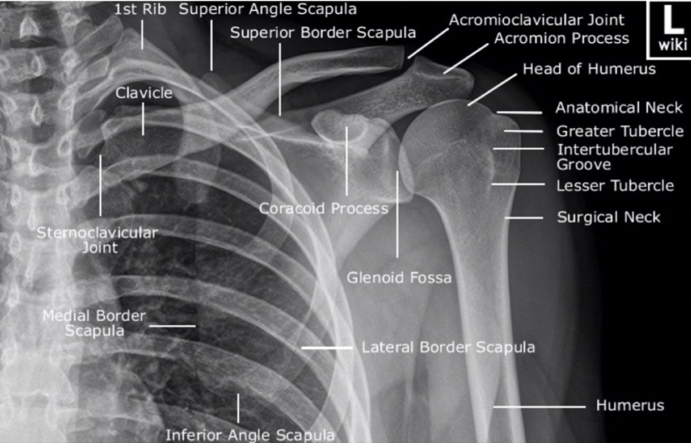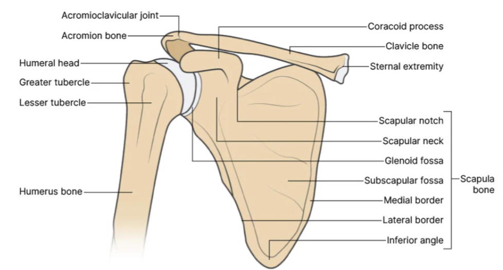 - Humerus ๐ฆด โ head articulates with glenoid; greater and lesser tubercles for cuff attachment; surgical neck clinically important.
