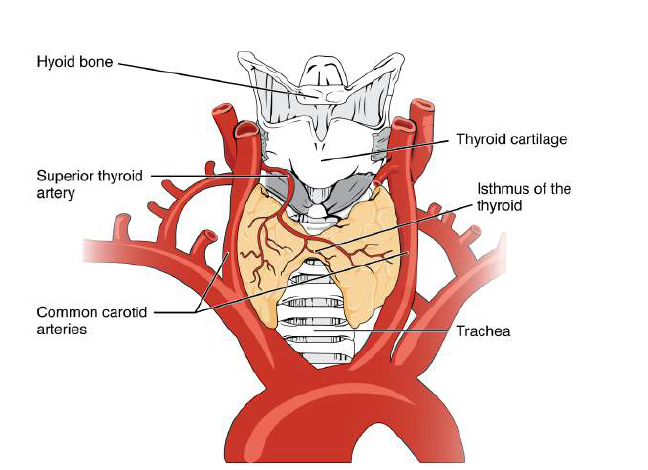 - Shape: Two lateral lobes connected by an isthmus (usually over the 2ndโ4th tracheal rings). A pyramidal lobe may be present (thyroglossal tract remnant).