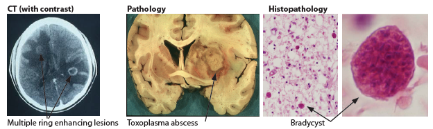 - In immunocompromised patients: reactivation causes cerebral abscesses.