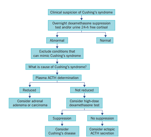 Diagnosis: screen with 24h urinary cortisol, overnight dexamethasone suppression, late-night salivary cortisol.